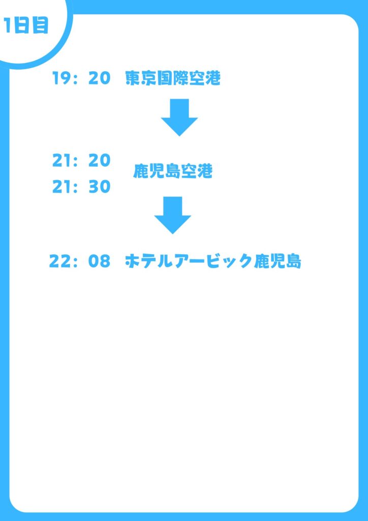 流れとしては羽田から鹿児島空港をえて、鹿児島中央に向かい寝るだけの1日です。
